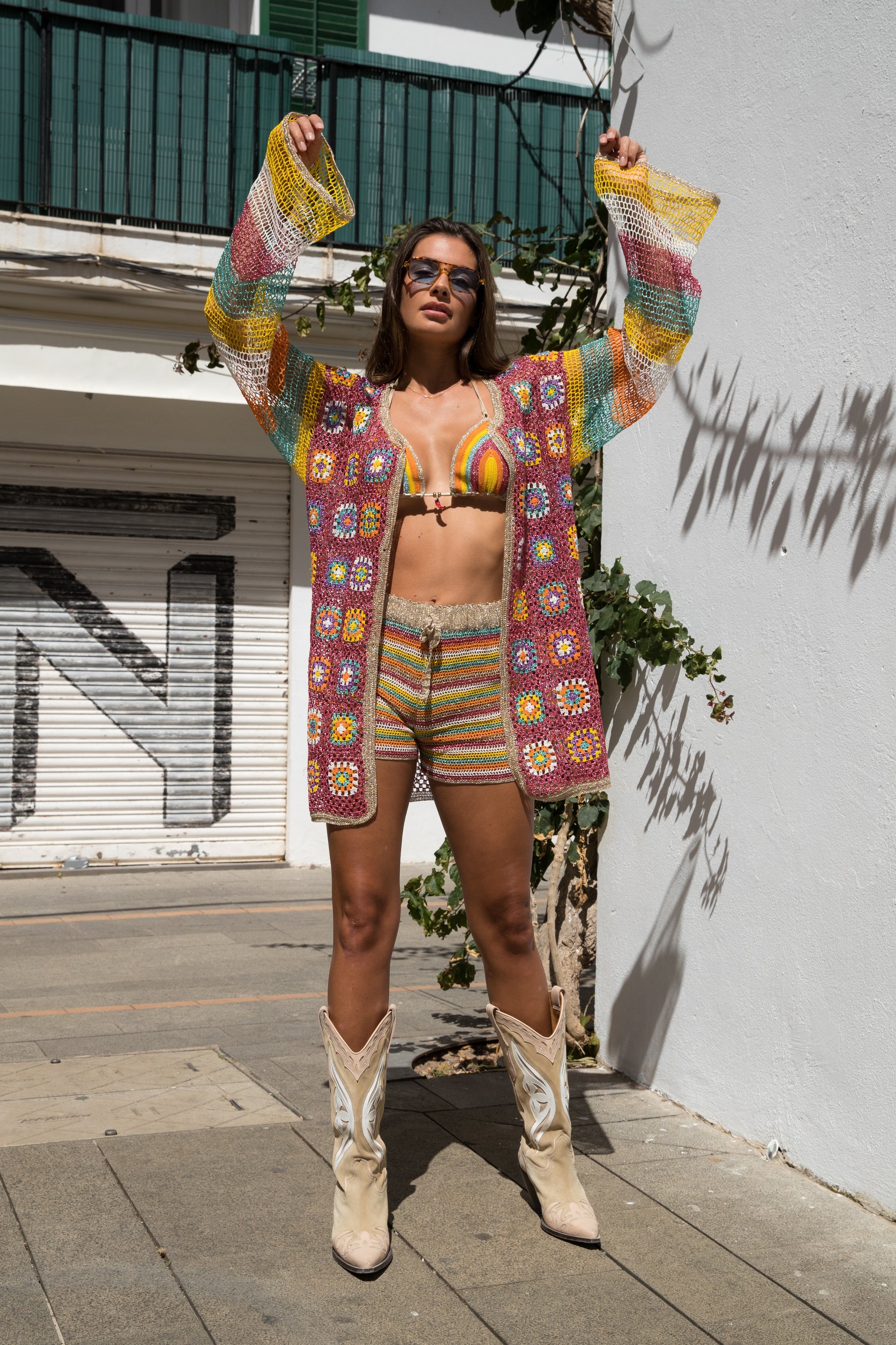 Short en crochet multicolore, détails luxeux avec finitions en fil doré.